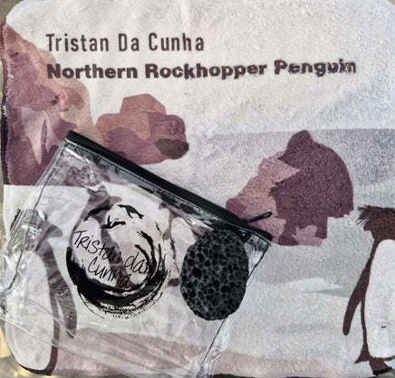 Beautiful handy wash bag- it includes a Penguin design flannel and a Tristan da Cunha volcanic scrubbing stone. (Locally known as "floating stone")